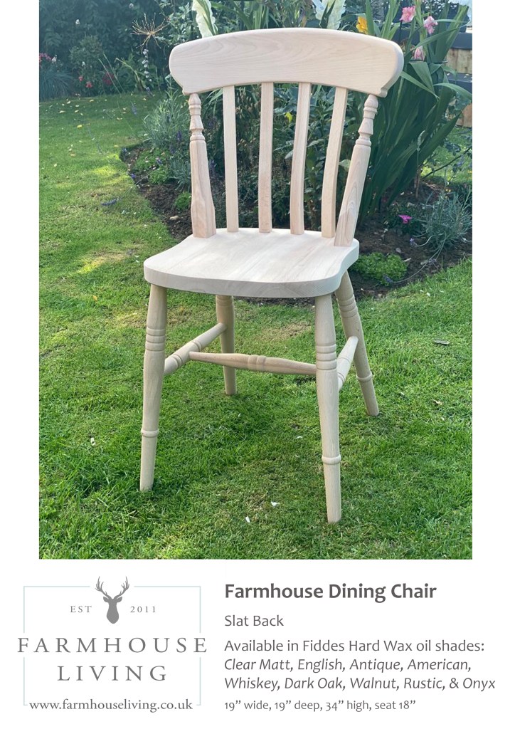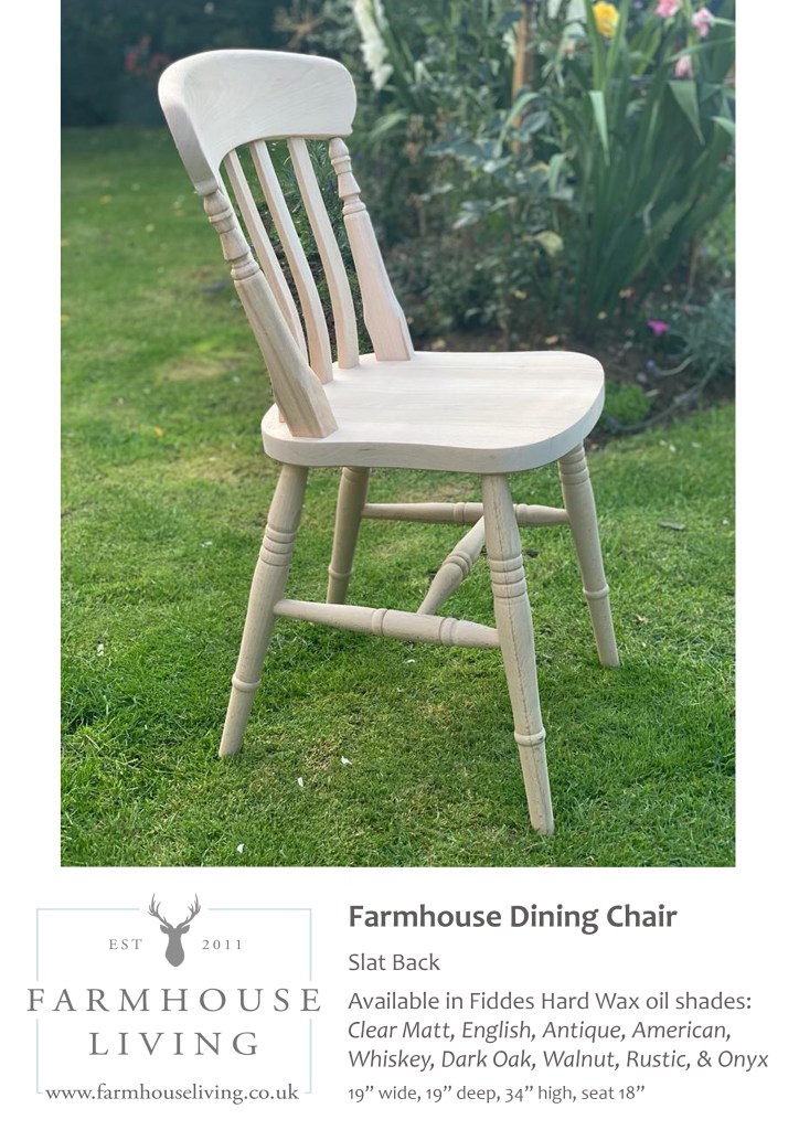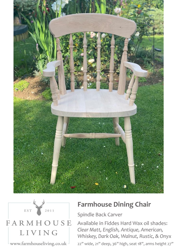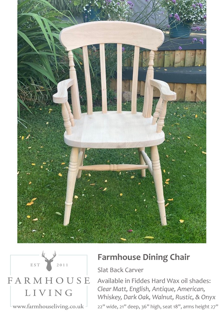 Traditional beech farmhouse chairs (regular & carver styles) in both slat back and spindle back designs- unfinished or hard wax oiled to match your chosen tabletop shade
